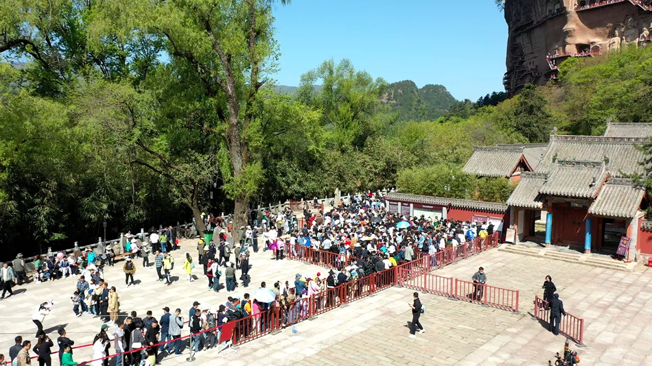 “五一”小长假是疫情防控政策调整后的第一个旅游高峰,各大景区旅客激增。国家5A级旅游景区麦积山石窟是众多外地游客的首选之地,上午十点,麦积山景区门票预约量已达上限。麦积山大景区管委会采取分流疏导措施,通过网站、微信、抖音、景区电子屏、公告栏等渠道,及时向社会各界发布了停止售票的公告,引导游客有序游览、错峰游览。伏羲庙景区上午九点开始,游客已经络绎不绝。与之毗邻的天水古城游客如织,兴夤夜方酣。青鹃山国际旅游度假区连日来人潮涌动,青鹃山童话小镇游乐场上人声鼎沸,孩子们玩得不亦乐乎。5月1日CCTV13《朝闻天下》节目,《暖心服务贴心管理 让游客玩得开心又放心》栏目,播出麦积山景区旅游情况视频,持续时长约1分钟。