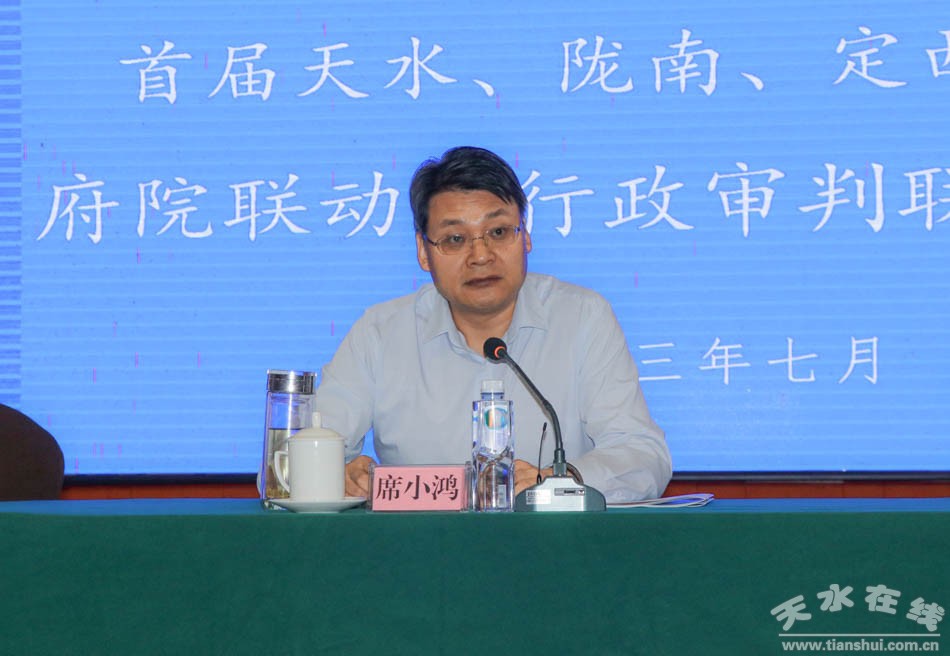 天水日报讯【新天水·天水日报记者马放】7月6日,首届天水、陇南、定西三市府院联动暨行政审判联席会议在天水召开。甘肃省高级人民法院副院长席小鸿出席会议并讲话,天水市委副书记、统战部部长杨晓锋出席会议并致辞。定西市副市长、公安局局长李进强,陇南市副市长、公安局局长陈贵生,天水市副市长、公安局局长郭庆祥出席会议并讲话。