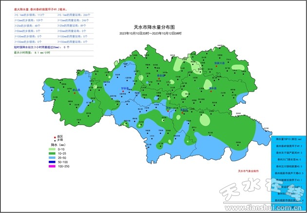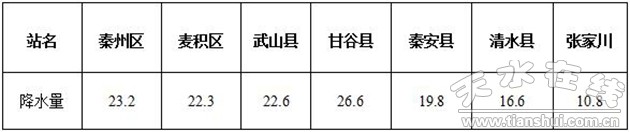 【摘要】受冷空气和高原暖湿气流共同影响,10日夜间开始我市出现降水降温天气,截止12日08时全市普降中到大雨,最大降水量出现在秦州秦岭镇蒿坪子,为49.2毫米。
