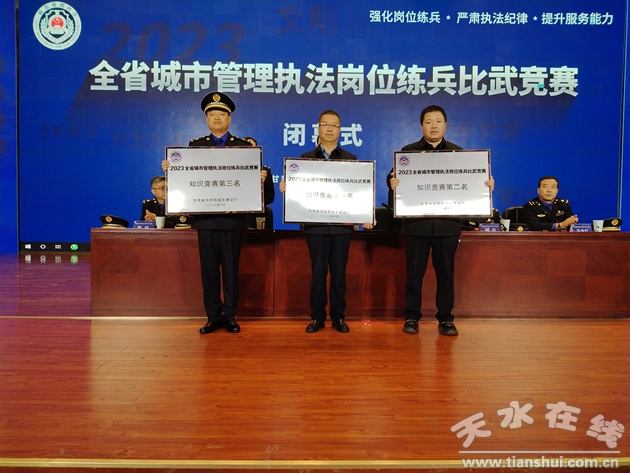 天水市住建局代表队经过三天的激烈角逐,在15支参赛队中脱颖而出,取得知识竞赛项目第二名、模拟执法竞赛项目第二名的优异成绩,顾娟娟等8名参赛队员荣获比武竞赛活动“学习标兵”、“练兵比武竞赛先进个人”等光荣称号。