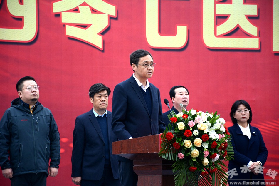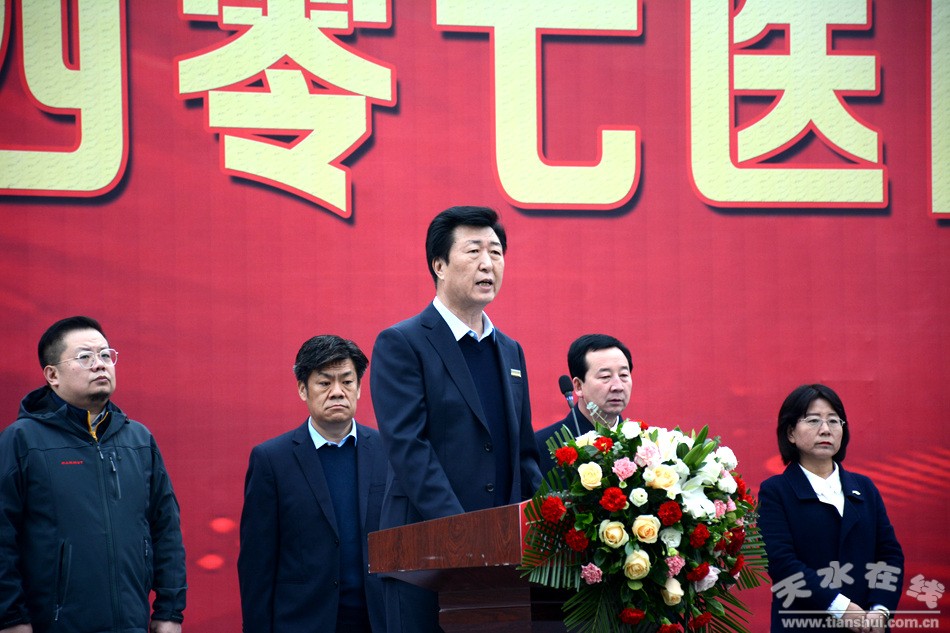 王国先在致辞中代表市委、市政府,对项目的开工建设表示祝贺,向长期以来关心支持天水卫生健康事业发展的各界人士表示感谢。他指出,近年来,天水市全面贯彻新时代党的卫生健康方针,深入实施人民健康优先发展战略,坚持以“健康天水”建设为统领,统筹推进卫生健康服务和经济社会协同联动发展,特别是把加快老龄事业发展、健全养老服务机制作为推进“健康天水”建设的着力重点,在老有所养、老有所医、老有所为、老有所学、老有所乐等方面取得明显成效。天水四零七医院康健康复·养老项目是我市康养产业融合发展的重点项目,对于加快补齐全市老年健康服务短板,持续优化老年健康服务,构建医养结合服务新格局具有重要意义。项目建设和施工单位要强化责任意识,加强统筹调度,精心组织施工,严格质量管理,真正把这一民生工程建设成为造福人民群众的示范工程、样板工程。秦州区和相关部门要建立“项目管家”服务机制,主动协调解决困难问题,全力以赴保障项目早竣工、早投用、早见效。