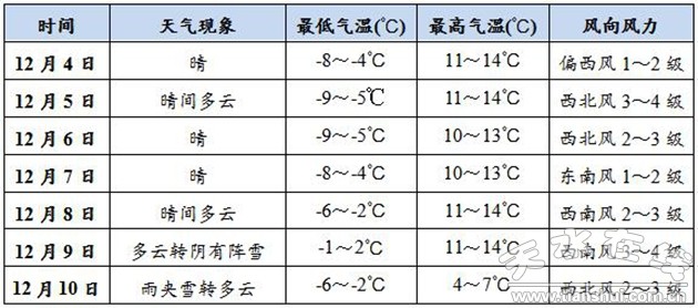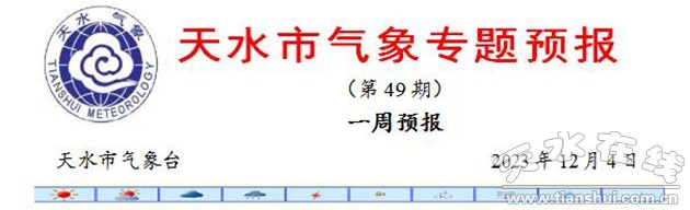 预计未来一周清晨气温较低,9日夜间~10日上午我市有一次弱降雪过程,秦州、麦积阴有雨夹雪,其余县区阴有阵雪。