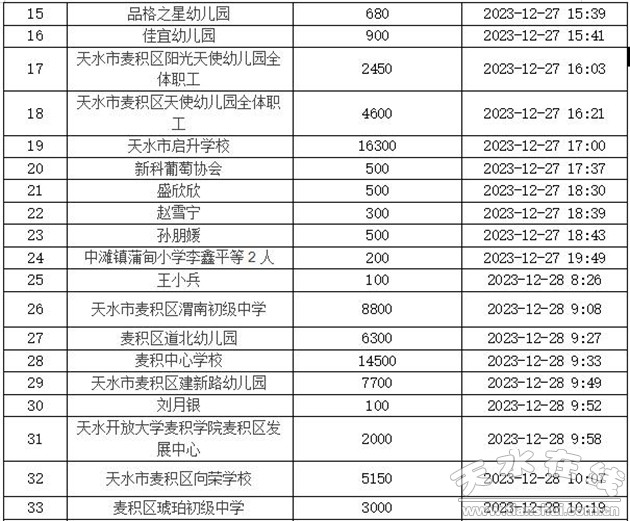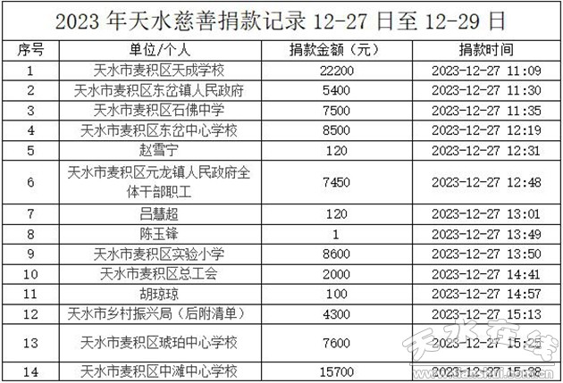2023年12月18日23时59分,甘肃省临夏州积石山县发生6.2级地震,天水市慈善总会及时启动预案,向社会各界爱心单位、爱心人士发出公开募捐《倡议书》,得到了社会各界爱心单位和爱心人士的积极响应,各爱心单位、人士踊跃捐款捐物,帮助灾区人民抗震救灾和灾后重建,共渡难关。截至12月29日11时,累计接收捐赠款物3100881.94元,其中捐款2849167.94元,捐赠物资折价251714元。12月27日11时—12月29日11时接收捐款595863.38元,捐赠明细如下:
