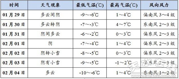 预计本周天气以多云或阴为主,2月1~3日全市有弱降雪过程。其中,1月31日白天秦州、麦积东南部乡镇有零星小雪,2月1日夜间武山部分乡镇小雪,2月2日夜间到3日夜间全市小雪,部分高海拔山区中雪。