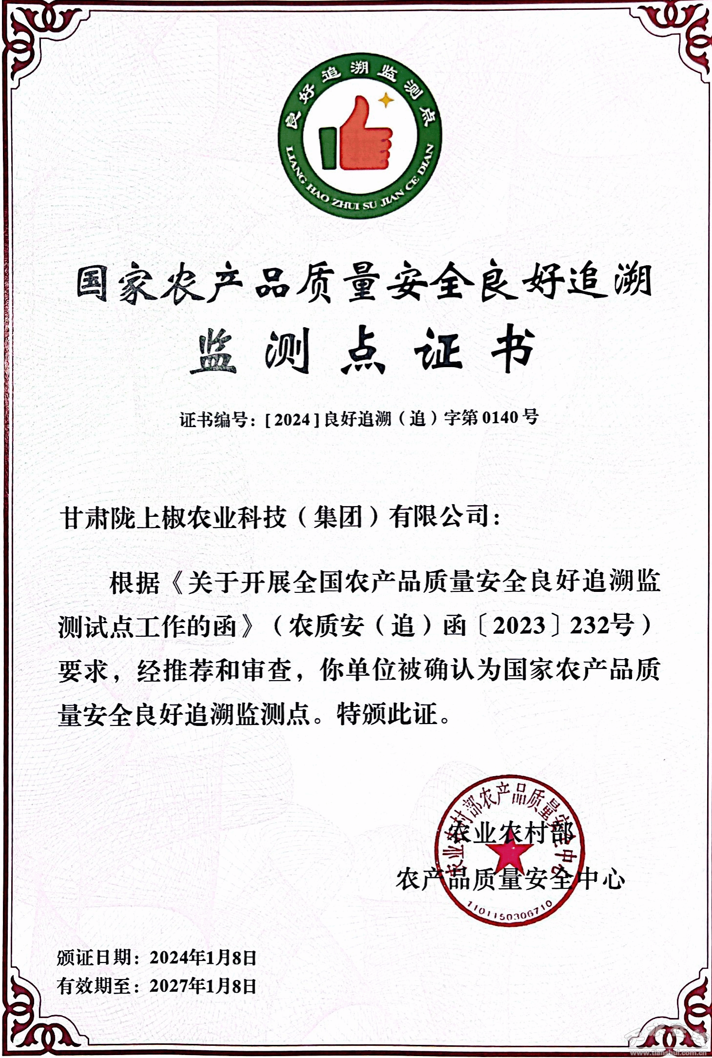 甘肃陇上椒农业科技(集团)有限公司位于我市甘谷县,主要从事辣椒、花椒等产品加工,产品涵盖辣椒面、辣椒丝、辣椒段、辣椒酱、油泼辣子、花椒等10多个系列34种产品,其中辣椒段、油泼辣子、花椒(干)、辣椒面、辣椒丝等5个产品通过了绿色食品认证,纳入了国家、省级农产品质量安全监管追溯平台,建立了企业内部管理制度和绿色食品辣椒生产技术规程,是国家高新技术企业、甘肃省农业产业化重点龙头企业、甘肃省甘味品牌企业。此次入选国家农产品质量安全良好追溯监测点是对企业产品质量管控、追溯体系建设的充分肯定。