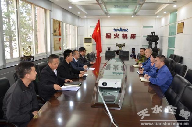 星火机床公司总经理赵锦铭,党群工作部部长蔡建欣、副部长马存福,公司驻村帮扶干部王璟等与清水县领导座谈。