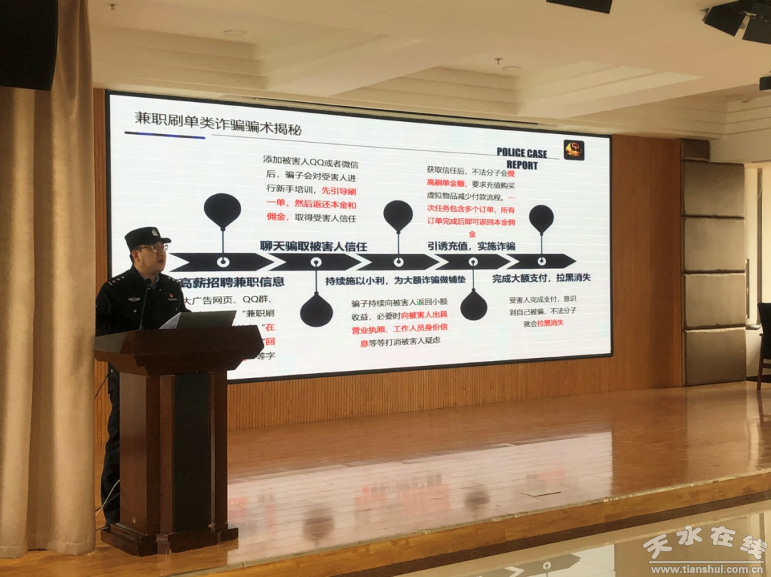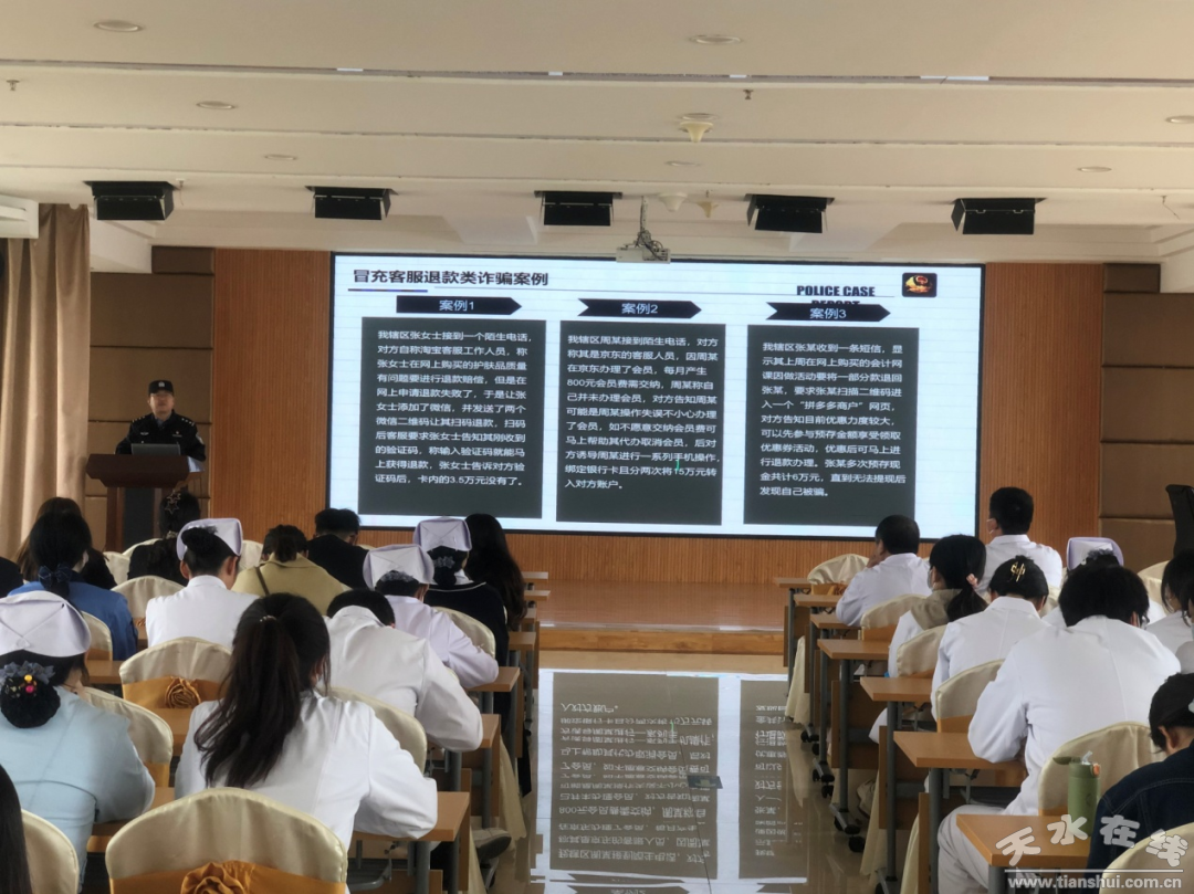为进一步遏制电信诈骗案件高发态势,积极创建天水市第三人民医院反诈宣传氛围,全力提升医院职工识诈防诈意识,推动平安医院建设,4月12日上午,天水市第三人民医院保卫科特邀请秦州公安分局天水郡派出所公安干警,为全院各科室、病区部分干部职工开展反诈防诈专题宣传培训。会前,保卫科长段旭钧同志强调了反诈防诈的重要性并对会场纪律作了相关要求。