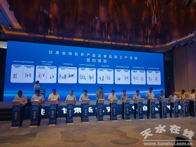 项目签约仪式上,我市甘肃安军农业有限公司与长沙红星二哥农业发展有限公司、甘肃天水圣慈药业有限公司与湖南三金制药有限公司、秦安县新润农业科技开发有限公司与长沙红星全球农批中心(高辉果业)现场分别签订了总投资1.8亿元的水果供应、1.35亿元的张家川县中医药产业供应合作、0.2亿元的果品购销项目。武山县津陇优品农业发展有限公司与长沙县嘉丁蔬菜经营有限公司、天水兴盛丰果业有限公司与长沙市雨花区高跃辉水果批发公司、秦安县雪原果品有限责任公司与长沙“果伊人”供销公司分别签订了投资0.5亿元的高原夏菜购销、0.21亿元的苹果购销项目、0.064亿元的雪原苹果购销项目。