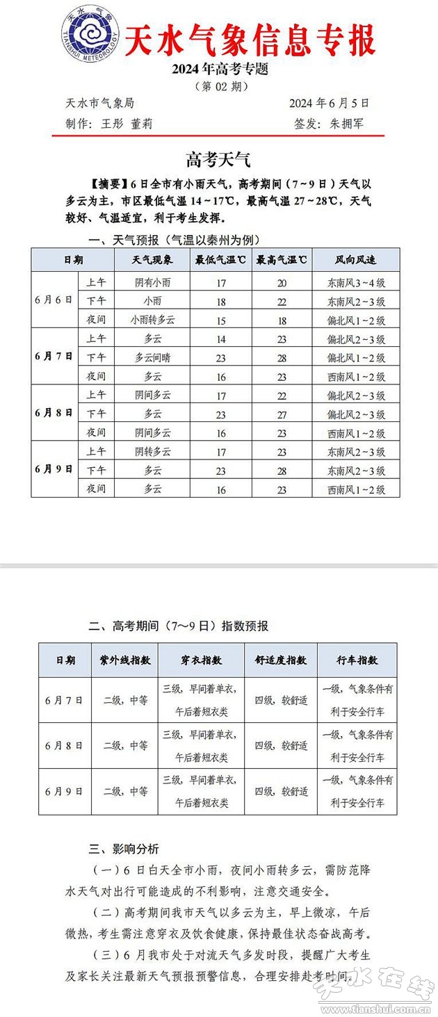 ·天水气象信息专报|2024年高考专题(第01期)·天水市气象台发布6月3日~6月9日天气预报