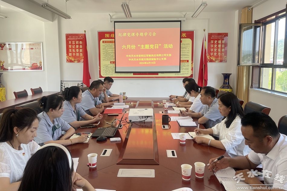 为深入学习贯彻习近平总书记关于党纪学习教育的重要讲话和重要指示精神,深入学习领会新修订的《中国共产党纪律处分条例》,推动党纪学习教育取得实实在在成效。6月14日,天水市救灾物资储备中心党支部、麦积区军粮供应有限公司党支部联合开展了“主题党日”活动。共计15名党员参加活动。