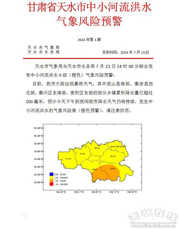 ·天水市发布中小河流洪水Ⅱ级(橙色)气象风险预警