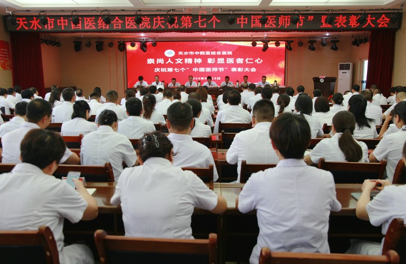 8月19日下午,天水市中西医结合医院(市二院)在多功能厅举办主题为“崇尚人文精神,彰显医者仁心”的庆祝第七个“中国医师节”暨表彰大会。会议由院长唐志锋主持。院班子成员、中层干部、受到表彰的团体和个人、从医30年优秀医师及医师代表约160余人参加。
