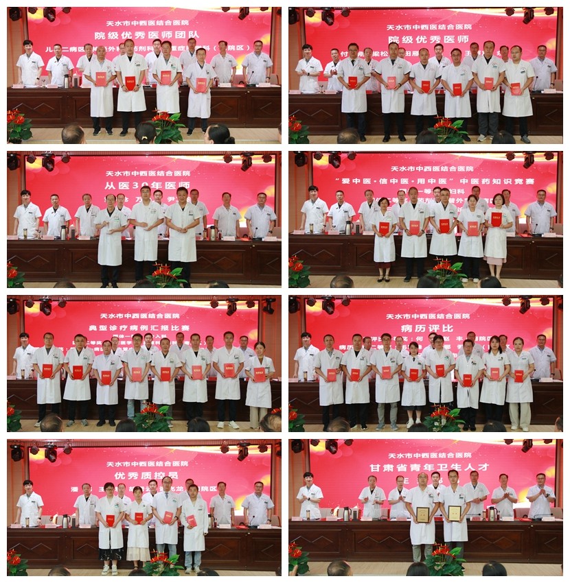 会上,天津西青医院帮扶专家徐雪军带领全体医师庄严宣誓;副院长赵子洲宣读《天水市中西医结合医院关于庆祝第七个“中国医师节”表彰先进集体和先进个人的决定》;副院长闫振录主持了颁奖仪式。院领导为受到表彰的优秀医师团队和个人;“爱中医·信中医·用中医”中医药知识竞赛、典型诊疗病历汇报比赛、病历评比、综合目标管理考核、“三基”理论考试等各项竞赛比赛、考试中荣获一、二、三等奖的团队和个人;优秀质控员、甘肃省青年卫生人才颁发了荣誉证书和奖牌。为从医30年优秀医师颁发了纪念杯。优秀医师团队和优秀医师代表分别进行了会议发言。