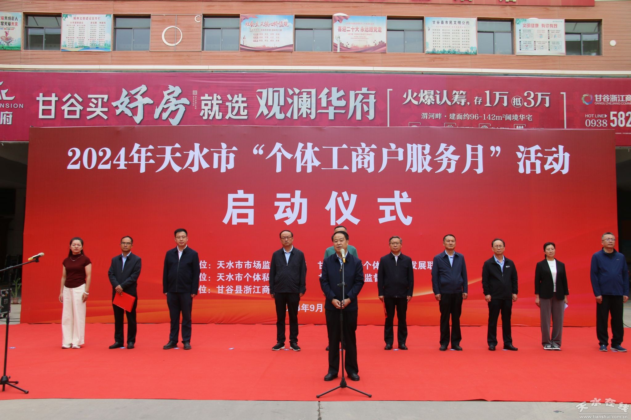 甘谷县人民政府副县长杨亮出席启动仪式并致辞。市市场监管局副局长贾文斌介绍了“服务月”活动总体安排。甘谷县市场监管局、甘谷县扶持个体工商户发展联席会议成员单位代表及浙江商贸城商户代表共计150余人参加活动。
