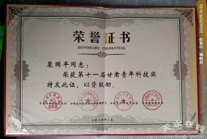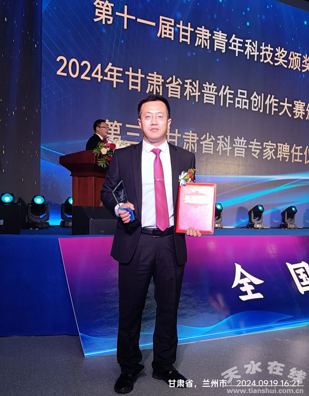 9月19日,由甘肃省委组织部、甘肃省人力资源和社会保障厅、甘肃省科学技术协会、共青团甘肃省委主办的第十一届甘肃青年科技奖颁奖仪式在兰州隆重举行。天水市农业科学研究所裴国平研究员获此殊荣,这是我市农业科研单位首次获得该奖项。