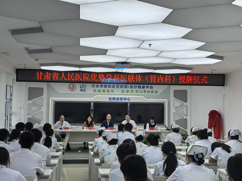 为进一步提升基层医院慢性肾脏病与血液净化专业医疗质量管理水平,9月20日,甘肃省人民医院肾病血液净化中心主任黄文辉带领专家团队一行莅临天水市第二人民医院开展肾内科医联体签约授牌仪式。市二院副院长姚雄兵应邀参加并讲话,签约授牌仪式由肾病血液净化中心主任黄积仓主持。院内相关专业医护人员约50余人参加。