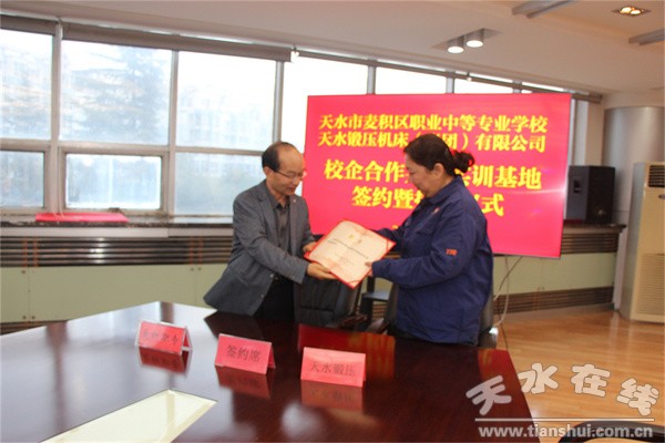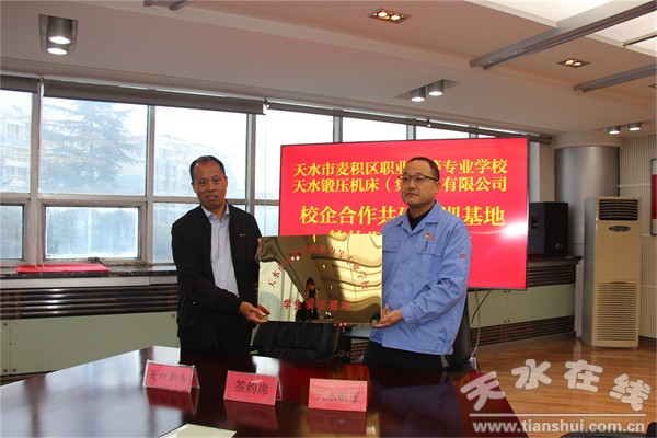 10月11日上午,天水锻压机床(集团)有限公司与天水市麦积区职业中等专业学校就校企合作、技能人才培养等事宜进行了座谈交流并举行校企合作共建实训基地签约暨授牌仪式。