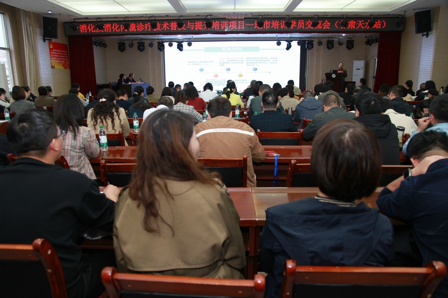 10月19日,由海南博鳌县域医疗发展研究中心发启的“消化及消化内镜诊疗技术普及与提升培训项目-地市培训学员交流会(甘肃天水站)”在天水市中西医结合医院(市二院)举办。特邀兰州大学第一医院副院长姬瑞教授、消化科及消化内镜中心副主任陈兆峰教授,西安交通大学第一附属医院消化科殷燕教授,西安交通大学第二附属医院消化科主任王进海教授、秦斌教授,新疆医科大学第一附属医院消化病二科主任张志强教授,甘肃省中心医院消化内科及消化内镜中心主任康生朝教授,兰州大学第一医院、兰州市第二人民医院消化科主任杜宏伟教授,兰州大学第二医院消化内科一病区副主任王鹏飞教授,甘肃省第三人民医院消化内科副主任刘鑫教授,兰州市第一人民医院消化内科主任陈晓琴教授,白银市第一人民医院消化内科、内镜中心主任王兴胜教授等专家莅临并授课。天水市卫生健康委员会主任王定新,天水市二院院长唐志锋应邀出席会议并致辞讲话。会议由市二院副院长姚雄兵主持。天水市两区五县消化科专业骨干约200余人参加。