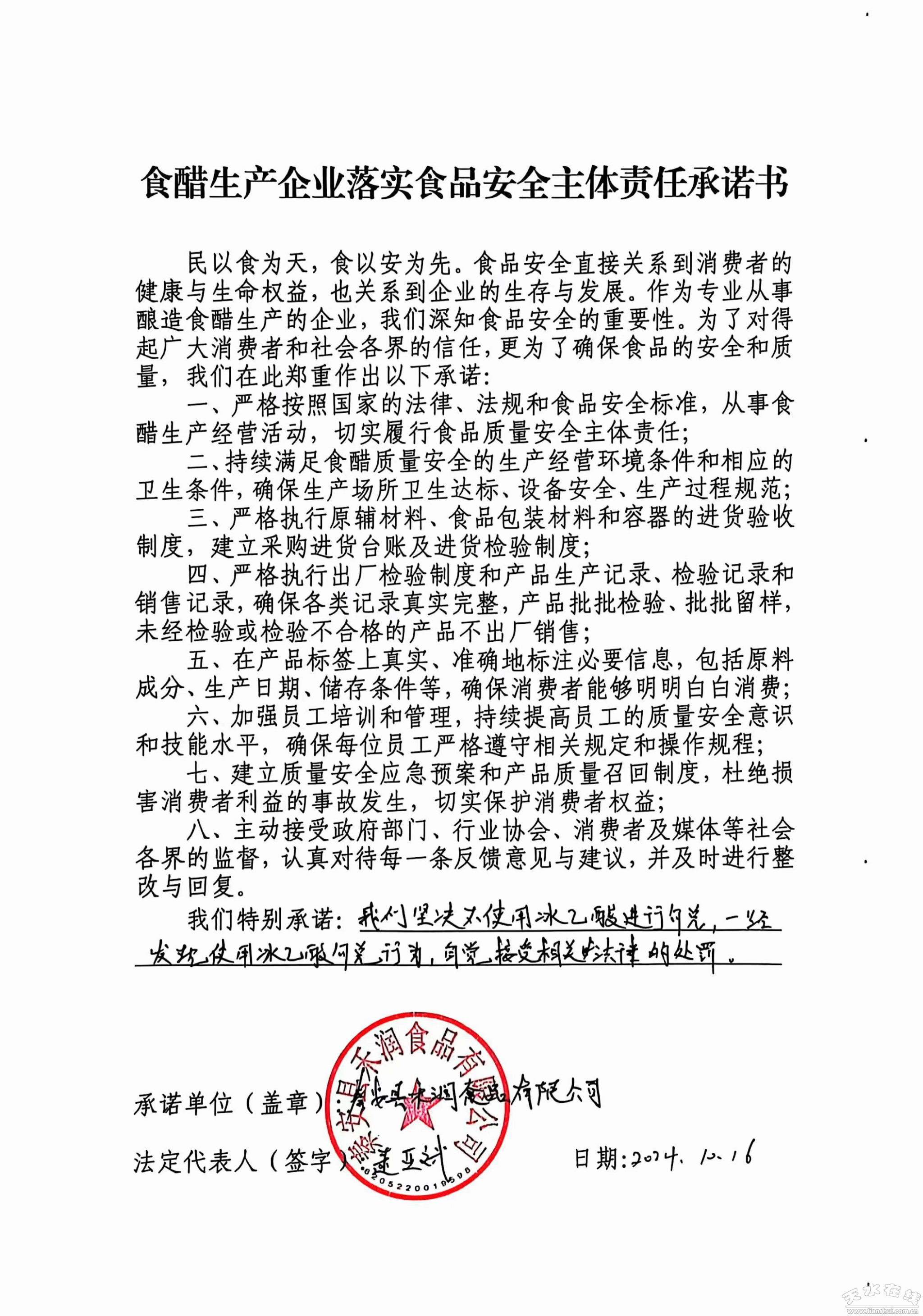 全市13家食醋生产企业签订了《食醋生产企业落实食品安全主体责任承诺书》,承诺将严格遵守国家法律法规和标准,建立健全食品安全管理制度和自查机制,积极配合市场监管部门的监督检查,及时整改存在的问题,确保产品质量安全。同时保证坚决不使用冰乙酸进行勾兑,一经发现使用冰乙酸勾兑行为,自觉接受相关法律的处罚。