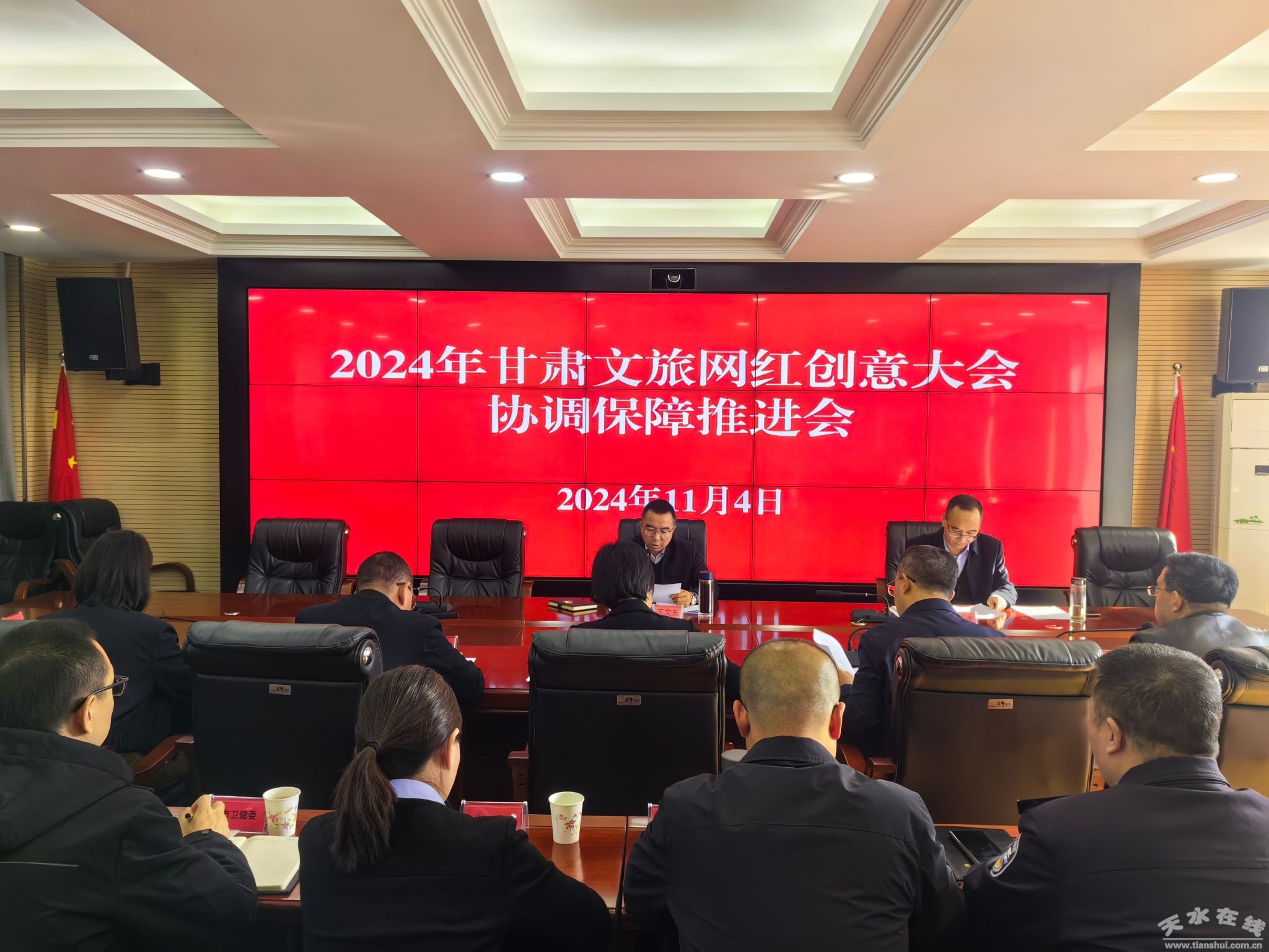为全力保障“2024年甘肃文旅网红创意大会”成功举办,2024年11月4日上午,天水市组织召开2024年甘肃文旅网红创意大会协调保障推进会,市委常委、宣传部部长王文东主持会议并讲话,市文旅局负责人宣读了《2024年甘肃文旅网红创意大会协调保障方案》,秦州区、麦积区、甘谷县、武山县和麦积山大景区管委会就工作进展情况进行了汇报。
