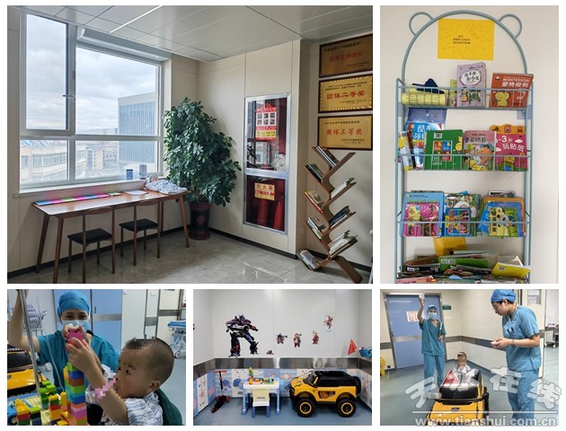 对于手术室紧闭的大门,大多数人感觉神秘而冰冷,尤其是儿童,对未知的环境没有安全感。我院手术麻醉科专门设立了儿童等候区,通过孙悟空、变形金刚卡通角色和积木桌等玩具吸引患儿注意力,用卡通玩具车将其送至术间,有效缓解了患儿紧张情绪,最大程度地减轻了患儿心理上的恐惧感。