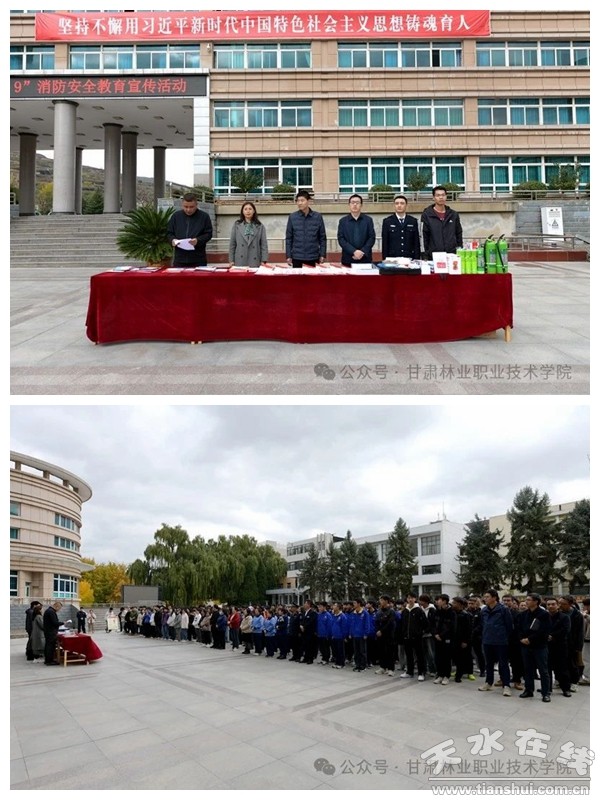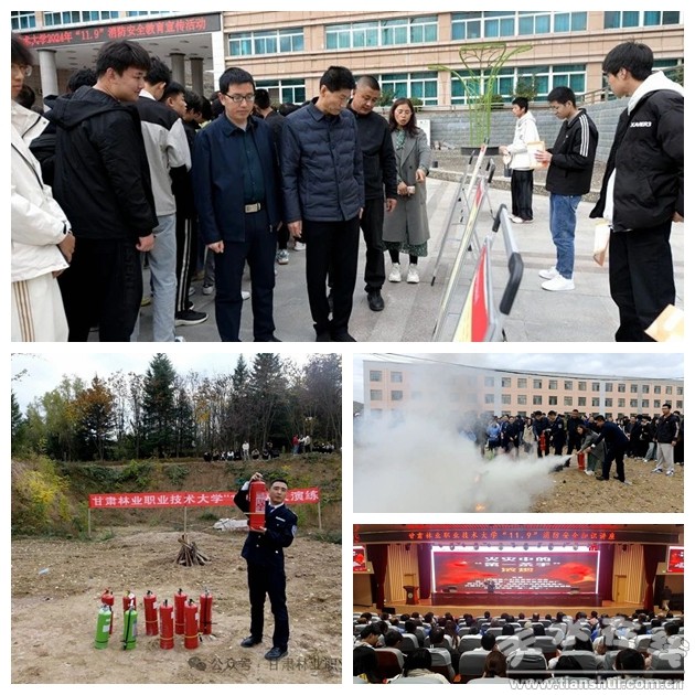 在第33个全国消防日来临之际,为了进一步强化广大师生员工的消防安全意识,提升消防应急处置能力,11月7日,学校联合兰州政安消防天水分中心举办了以“全民消防·生命至上”为主题的2024年“11.9”消防安全教育宣传活动。党委副书记许祖生出席。党委宣传部(统战部)、教务处、学生处、保卫处、饮食管理中心、信息技术中心等部门负责人,各二级学院实验实训室管理员、辅导员组长、学生代表,全体楼管员、安保人员和饮食管理中心从业人员800余人参加。