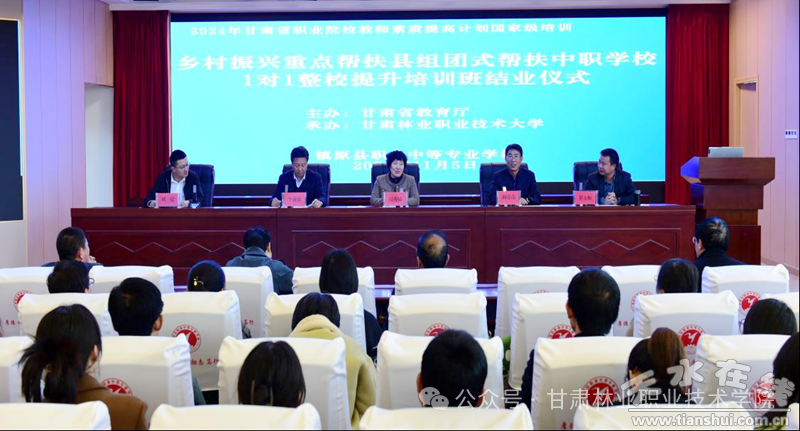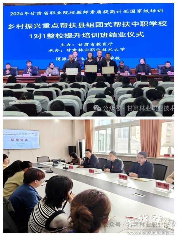 11月5日,由甘肃省教育厅主办,甘肃林业职业技术大学承办的2024年甘肃省职业院校教师素质提高计划国家级培训——乡村振兴重点帮扶县组团式帮扶中职学校1对1整校提升培训班在镇原县职业中等专业学校举行结业仪式。我校党委委员、副院长闫秀婧,镇原县职业中等专业学校校长胡春亮、常务副校长李效清出席会议,组团式帮扶培训组成员、全体参训教师参加。