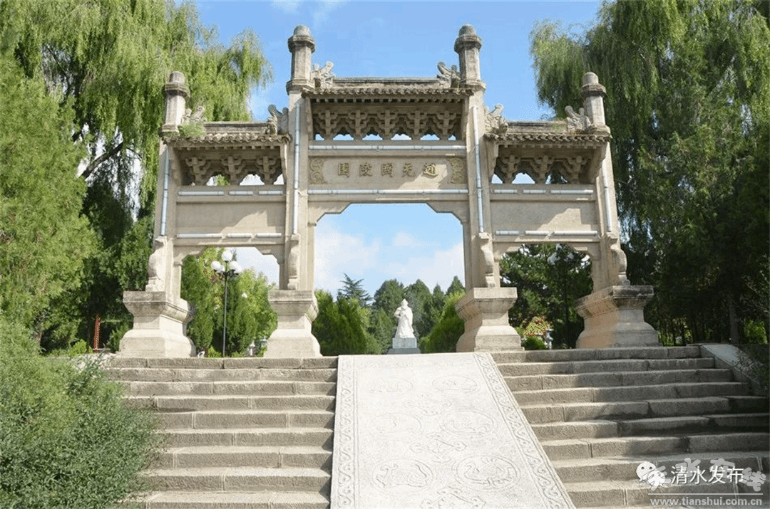 【赵充国陵园】位于清水县城,修建于汉代。主要包括赵充国墓区、宋金墓葬群博物馆、碑林区。赵充国墓冢高3.8米,底径10米,冢前左右树立遗存碑亭两座,内立清嘉庆年间“汉后将军营平侯之墓”和清光绪乙酉年“汉故将军营平侯之墓”的石碑两通,是重点文物保护单位。