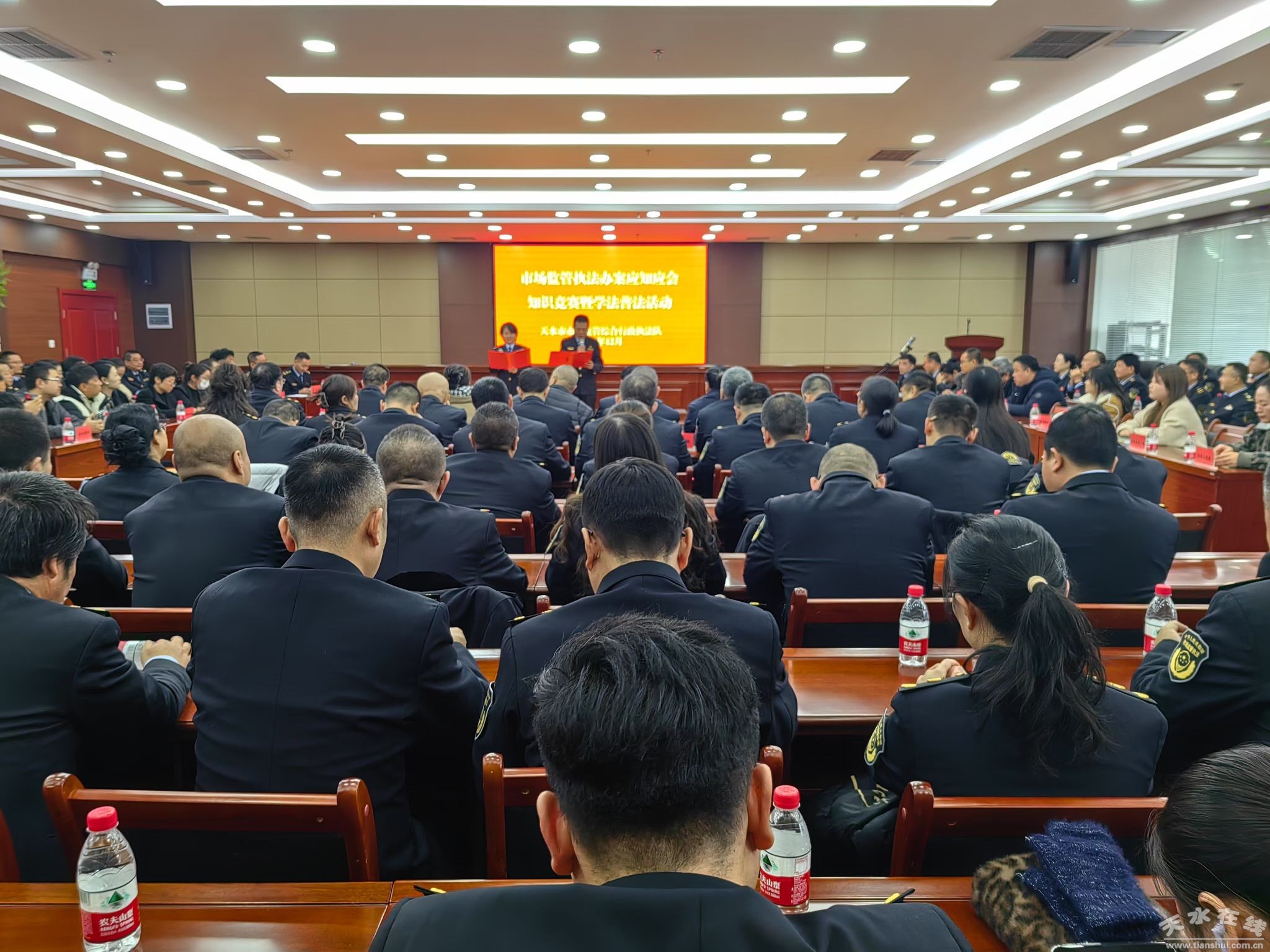 为深入学习贯彻党的二十大和党的二十届三中全会精神,全面贯彻落实党中央、国务院和省、市关于法治建设的部署要求,努力提升执法人员的业务素养和服务意识,近日,天水市市场监管综合行政执法队组织开展市场监管执法办案应知应会知识竞赛暨学法普法活动。执法队全体干部职工、退休职工代表、特邀各企业代表共计150余人参加活动。