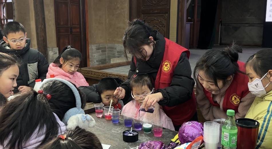 紧接着,精彩的腊八蒜科学实验课开启。宣讲员指导学生进行“紫甘蓝变色水”实验,抽丝剥茧般剖析腊八蒜制作原理,探讨其变色奥秘。面对“腊八蒜为何变绿”“为何不太辛辣”等趣味问题,学生们积极互动,现场气氛热烈,大家都沉浸在知识探索的快乐里。