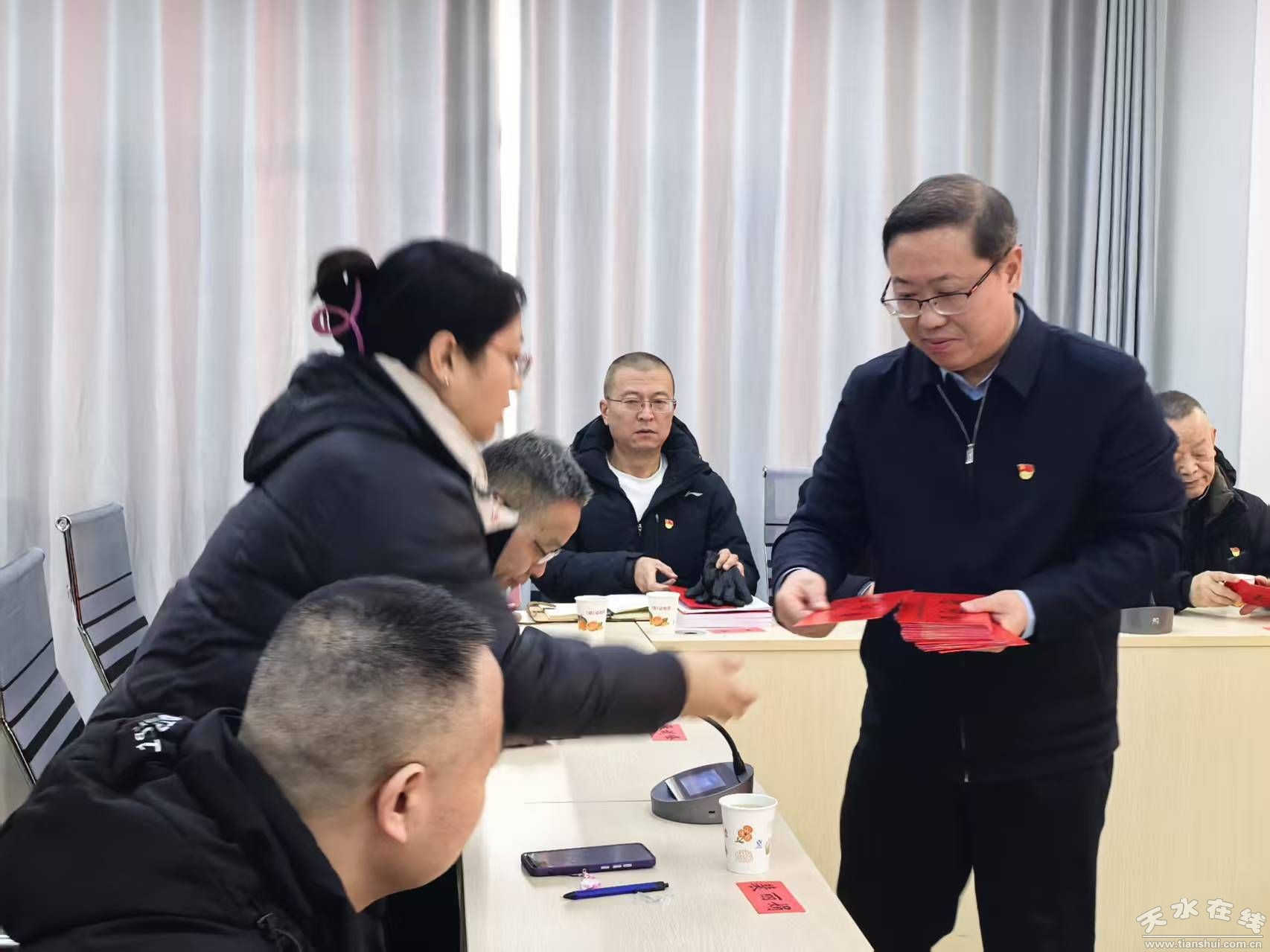 座谈会现场温馨四溢、欢乐祥和。市非公党委通报了2024年全市非公党建工作开展情况,市市场监管局党组成员、副局长贾文斌同志为参加活动的30余名党员逐一发放了慰问金,并与他们亲切交谈,了解他们的工作、生活及健康状况,3名党员代表、1名党支部书记代表回顾了过去一年里个人成长、党组织建设、党建引领企业发展等方面取得的成绩,对以高质量党建持续引领赋能非公企业高质量发展进行了展望,并就做好新一年非公党建工作提出了意见建议。