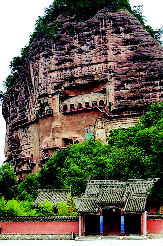 麦积山是在僧帽山、罗汉崖、豆积山、香积山、小献山、夕照壁、苍龙岭和蟠桃峰等群山环抱中拔地而起的一座秀丽山峰。山崖上栈道勾连,洞窟如巢,在众多的洞窟里塑有自北魏至唐宋时期诸朝塑像,因其艺术之精湛被誉为“东方雕塑陈列馆”。整个山崖与盘绕半环形的苍龙岭相连,在半环型内侧自然形成一块较为宽阔平坦的场地,为游览者摄影、小憩和野餐提供了极大的方便。场内整日游人如梭,喧若闹市。场地背靠麦积崖下是麦积山寺,亦即瑞应寺。场地之南原建有一座庙会时演唱地方戏的戏楼,场地中心有一水池,配置有亭榭回廊。池水中开满莲花,“有风既作飘摇之态,无风亦呈袅娜之姿”,莲叶搭蓬,花开水面,濯清涟而不娇,疑是天宫瑶池,被誉为莲花池。