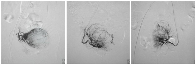 三位患者在妇科入院后接受了全面检查,通过院内多学科诊疗团队(MDT)进行全面、细致的评估,同时结合患者及家属意愿,选择行“子宫动脉介入栓塞术(UAE)”,由我院介入治疗专家高国明主任医师带领妇科团队制定个性化介入治疗方案并顺利实施。术中,在医学影像设备的引导下,通过患者大腿根部约2mm的穿刺点局麻后,将极细的导管精准地插入子宫动脉,注入栓塞材料,阻断子宫肌瘤的血液供应,使其“原位灭活”,肌瘤逐渐萎缩、吸收,达到治疗目的。介入手术患者全程清醒无痛苦、创伤小、恢复快,避免了传统外科手术创伤及术后并发症,既保留了育龄女性子宫功能和正常生育能力,又促进家庭关系稳定和谐,保护了中老年女性盆腔脏器功能,为患者提供了更高水平、更高质量、更高效率的医疗服务,全方位、全生命周期保障妇女健康。术后,三位患者各项生命体征平稳,恢复良好,对治疗效果十分满意。