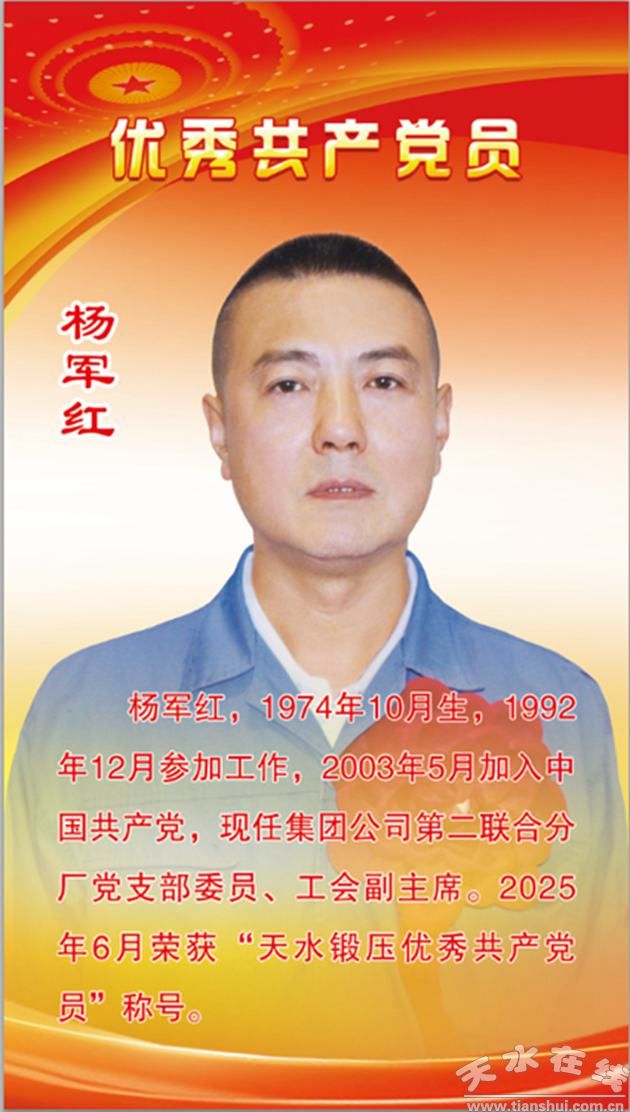 杨军红,天水锻压机床(集团)有限公司第二联合分厂调度员、工会主席。他扎根生产一线30余年,积累了丰富的工作经验,取得了突出的工作成果。
