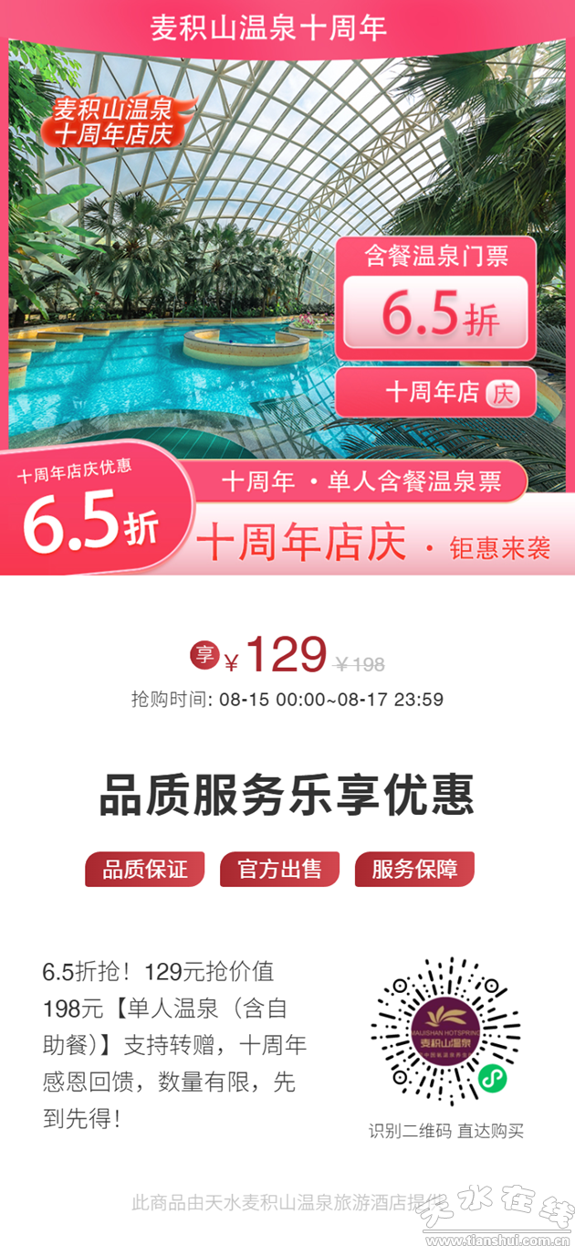 麦积山温泉十岁啦!🎉感恩有你,狂欢升级!整整10年的温暖陪伴,必须玩点大的!8月15日-17日,开启#温泉狂欢季#,天然温汤里不仅有惬意,更有超值福利、劲爆大奖和穿越式狂欢等你来嗨!