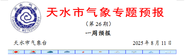 预计未来一周全市以晴或多云天气为主,其中11日下午~12日上午有雷阵雨,局地伴有8级以上雷暴大风。气温预报以秦州区为例,日最低气温18~21℃,日最高气温31~33℃。