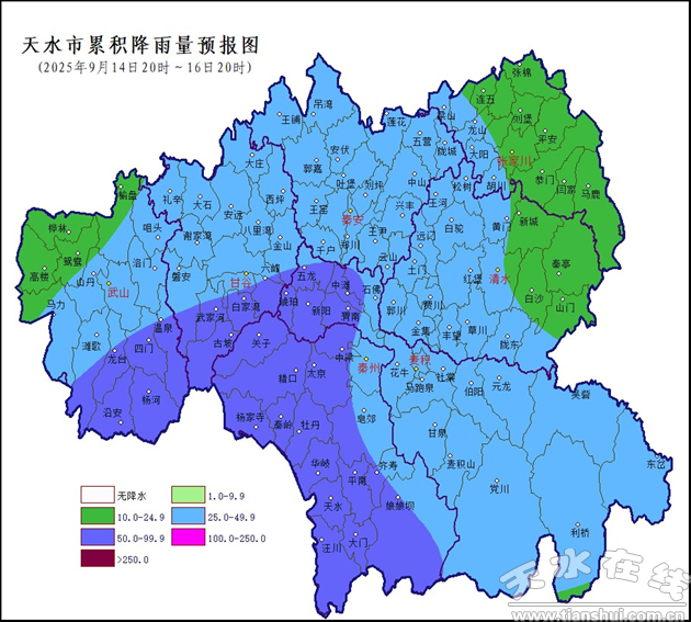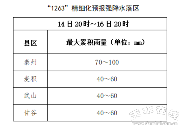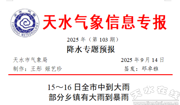 【摘要】预计15日至16日白天全市又有一次明显降水天气,量级以中到大雨为主,秦州区大部、麦积区北部、武山县南部、甘谷县南部有大雨到暴雨,过程雨量20~50毫米,个别乡镇最大可达70~100毫米。主要降水时段为15日12时~16日11时,期间局地伴有短时强降水,最大小时雨强20~40毫米。需注意防范降水叠加引发的地质灾害及局地强降水引发的山洪、城乡积涝等次生灾害。