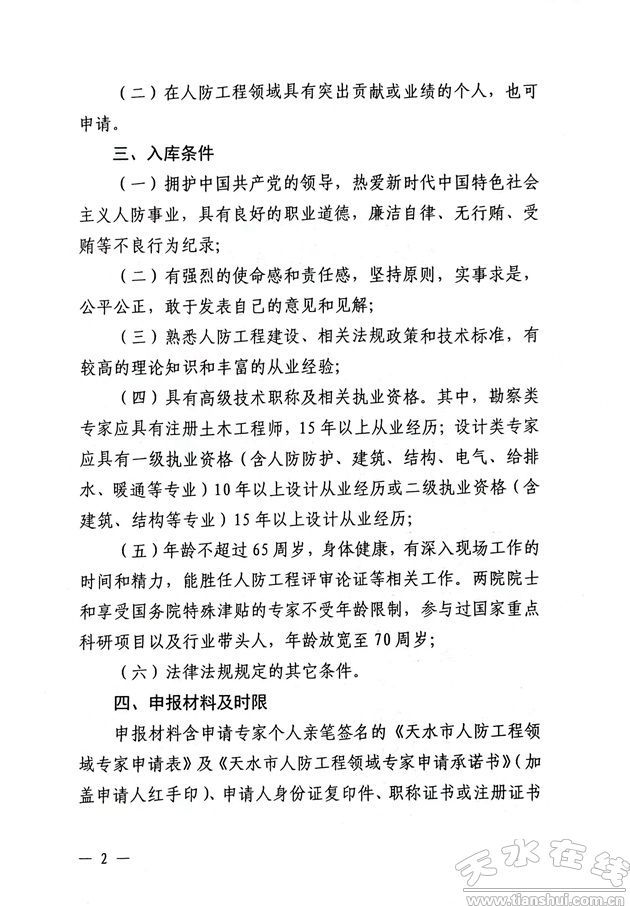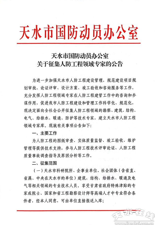 为进一步加强天水市人防工程建设管理,规范建设项目规划审批、论证评审、设计方案、竣工验收和咨询服务等工作,充分发挥人防工程领域专家在人防工程建管工作中的咨询和参谋作用,促进我市人防工程建设和管理工作科学化、规范化,现决定面向全社会公开征集人防工程领域的勘察、建筑、结构、电气、给排水、暖通、防护等技术专家,建立天水市人防工程领域专家库。现就有关事项公告如下: