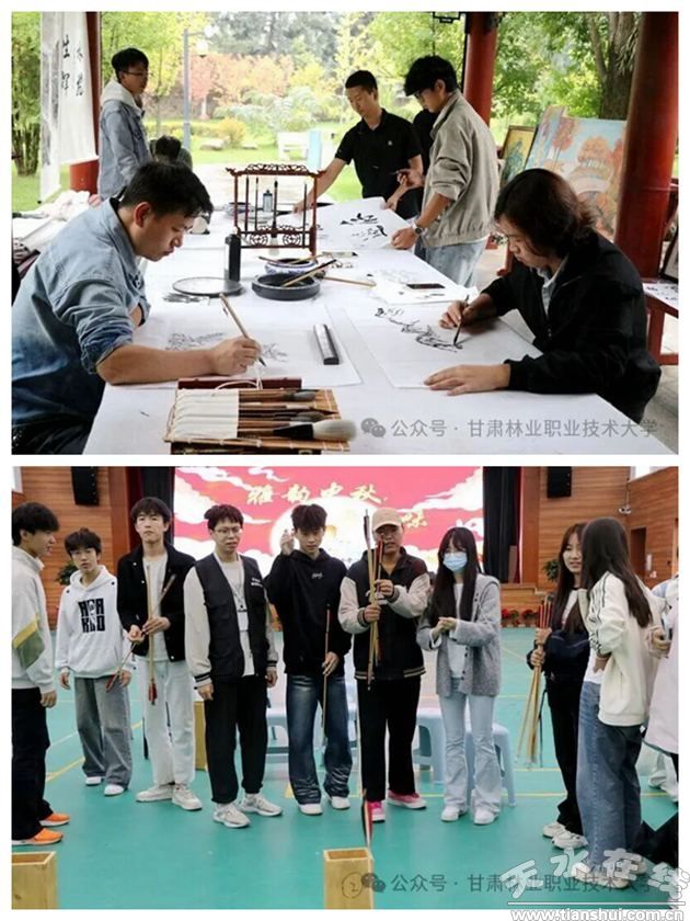 本次活动紧扣中秋主题,打造了九大特色活动板块,内容丰富且亮点纷呈。“翰墨书双节,同心庆华诞”书画笔绘邀师生联袂创作,以笔墨勾勒节日意蕴;“月满壶缘”时光邮局供同学们执笔寄语,将心愿托付未来;“雅趣游园”猜灯谜环节巧设谜题,尽显传统文化魅力;“纸短情长”祝福互换活动传递心意,让校园温情流转;“巧绘林韵”漆扇制作巧妙融合非遗技艺与学校林业特色,赋予传统手作独特“甘林印记”;“诗海拾贝”飞花令以诗会友,弘扬中华诗词文化;“箭”证实力投壶游戏复刻传统体育,让师生体验古人雅趣;“弈”战到底棋类博弈以棋益智,激发思维竞技活力;“花漾中秋”插花艺术课程则以花为媒,提升师生审美素养。