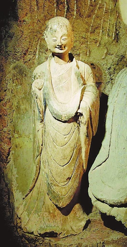 山无言,洞窟里的佛塑像、菩萨塑像和沙弥塑像同样无言,但他们笑,轻轻地笑,微微地笑,慈祥悲悯地笑,羞羞怯怯地笑。微笑无声,却能让人真切感到萦绕在洞窟四壁的声音,这是人间最美妙的音符,一个浅浅的微笑,就如一粒荷叶上的晨露,晶莹透亮、纯粹宁静。