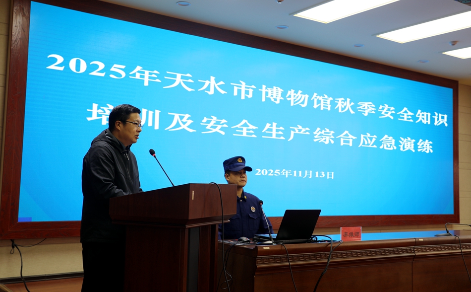 为认真贯彻落实习近平总书记关于安全生产工作的重要指示批示精神和近期国家、省、市下发的安全生产工作一系列文件要求,结合2025年全市消防宣传月活动,以“理论赋能实践,演练检验成效”为核心,全面促进我馆安全生产工作,提升全馆职工安全防范意识与应急处置能力,切实保障文物、古建筑及人员生命财产安全。11月13日上午,天水市博物馆组织全馆干部职工开展了安全生产知识培训及应急演练活动。