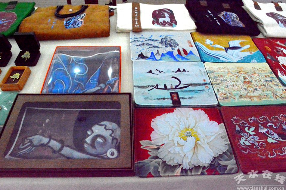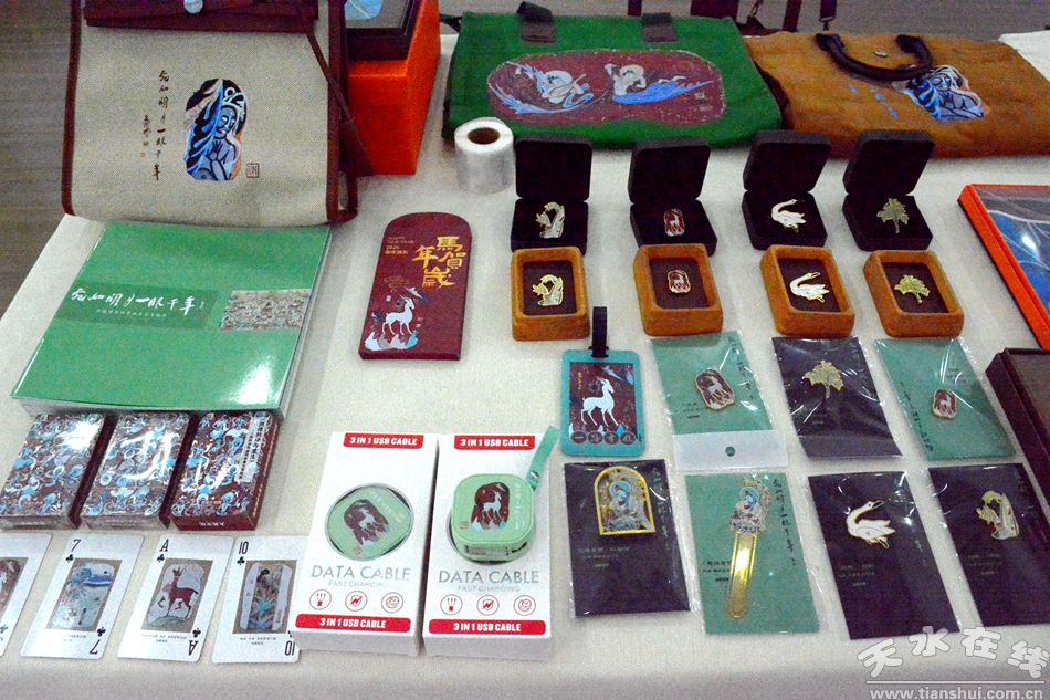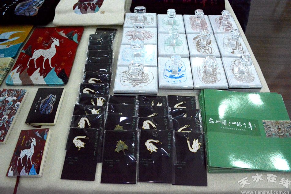 此次展览突破传统展陈范式,创新融合诗歌、书法、绘画、篆刻、音乐、舞蹈、摄影等多元艺术形式,构建沉浸式文化体验空间,引领观众穿越时空与敦煌对话。展览共展出摹写敦煌壁画泥板画60幅作品,分为六个单元:“故事”“动物”“佛”“山水”“植物”“飞天”,系统呈现敦煌艺术的多元美学体系。展览一并展示作品配套文创研发产品近30款,有帆布包、笔记本、书签、冰箱贴、鼠标垫、扑克牌、行李牌、打卡印章等,与观者互动交流,让敦煌文化走入我们每一个人的身边,让敦煌文化触手可及。