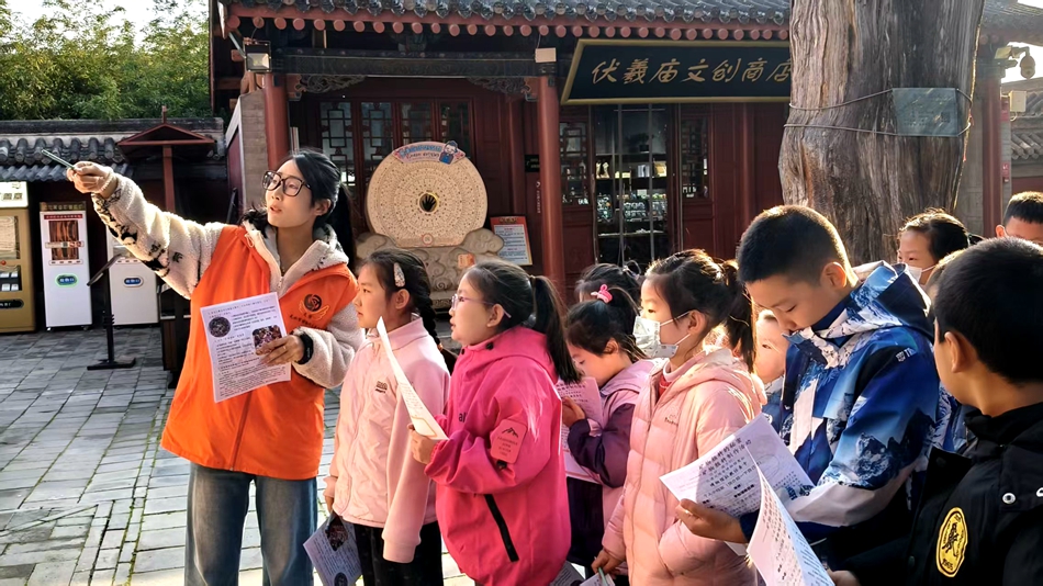 随后,带领孩子们走进伏羲庙实地观察团龙槛窗木雕。亲眼见证矿物颜料历经多年不褪色的神奇,把刚学到的知识和实物对应起来,孩子们一边辨认朱红、青绿等颜色,一边惊叹于矿物颜料抗褪色的神奇特性,在观察中深化了对传统工艺的理解。