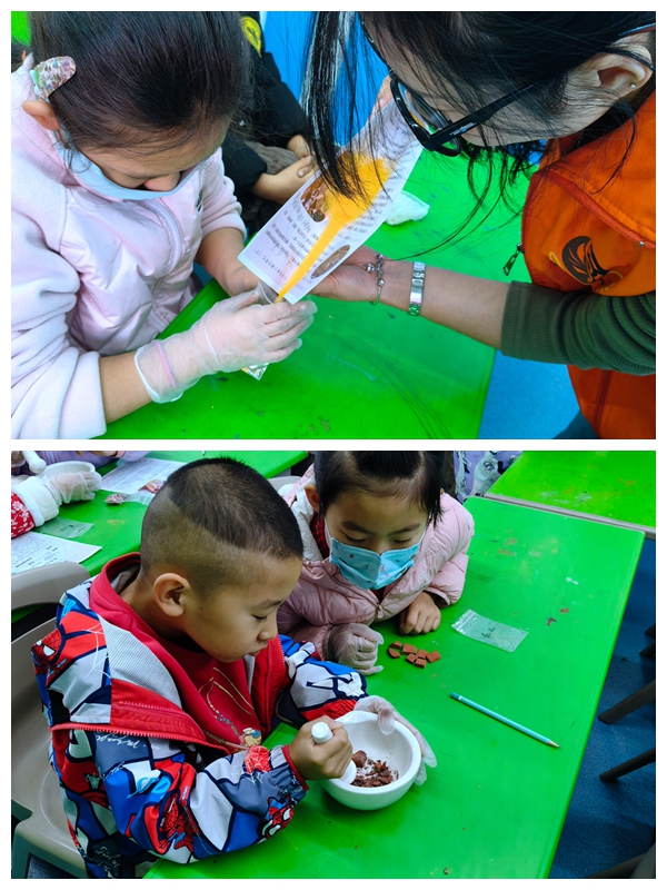 活动以伏羲庙团龙槛窗木雕上依然鲜明的色彩为引,为孩子们揭开了矿物颜料的神秘面纱——朱砂、石青、石绿……这些美丽的颜色,竟源自天然的矿石、土壤乃至贝壳。宣教老师娓娓道来,从新石器时代彩陶上的原始矿物色,到唐宋绘画中的富丽丹青,再到明清工艺品中的细腻用色,为孩子们梳理出一部生动的“矿物颜料成长史”。通过与现代化学颜料的对比,大家更直观地感受到传统矿物颜料纯净、持久、环保的独特价值。