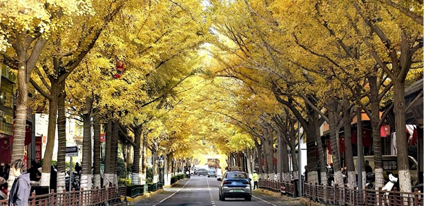 深秋的阳光穿透枝叶,冬日的寒气步步逼近,那些扇形的小叶片由翠绿转为金黄,如同被阳光镀上一层金粉,形成了壮观的“满目杏叶如黄金”的特殊效应,以最惊艳又使人人陶醉的姿态闯入人的视觉,成为秋日最搅动人心的风情线。人们在欣赏季节变换时节这份美景的同时,深深感受到大自然带给人间色彩的千变万化,带给人们风景这边独好的喜悦和欢乐。