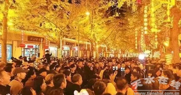 人山人海般的人流,像掀起的一波又一波海潮。每个人尽情的享受热烈又奔放,浪漫又温馨,情意满满,惬想无限的金黄杏叶装扮而成的梦幻夜晚。人们载歌欢舞,各类表演轮番上阵。专业歌手,业余歌手们高昂激昂的歌声,饱含着对家乡的深情,对祖国的祝福。各种演艺掀起一个又一个高潮,汉唐服饰表演,秦腔联唱,雅致韵味的器乐、古琴、古筝、书法、茶艺表演,当地非物质文化遗产的秦州夹板舞、秦卅小调等特色文艺节目,使人们目不暇接,大饱眼福。武术、太极、健身操、气功等多项深受广大群众喜爱的体育项目登场表演。自发自演的秦腔,歌舞等精彩上演,汇成了欢乐的海洋,人人都陶醉在片片金叶中的欢笑中,构成了一幅生动的夜景画卷。此刻,无论是市民,还是外地游客,工作的压力,生活的疲惫,心中所有的烦恼,通通都被忘掉,留下的是难忘的秋日回忆,夜幕中,以“丰收秦州”为主题的特色农产品琳琅满目集中展销,天水的特色美食,“麻辣烫百米长桌宴”食客满座,人气旺旺,吸引了众多的游客,在深秋的凉意中,人们围坐长桌,在欣赏美景的同时,大饱口福。此时此刻,人与美景的融合,精彩的文艺表演,民俗特色的展示,让身临其境的众多游人,外地游客惊叹,这那是一条街,而是集文化汇演、体育健身、全民互动于一体的城市会客厅。有内蒙网友留言:游玩天水麦积山、伏羲庙、南郭寺等景点,神奇迷人。品尝了天水麻辣烫和特色小吃,满满的口福,身临到天水黄金大道,更是令人心醉。深深感叹这片神奇的土地,充满着使人眷顾的魅力与无尽的风情。更感慨这座城市厚重的历史文化底蕴和新时代文旅创新的交融给予市民们追求幸福感,享受美好生活带来的无限乐趣。