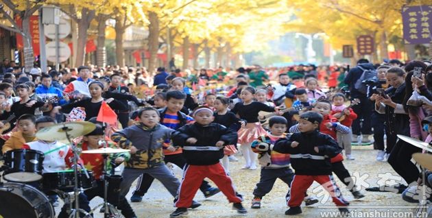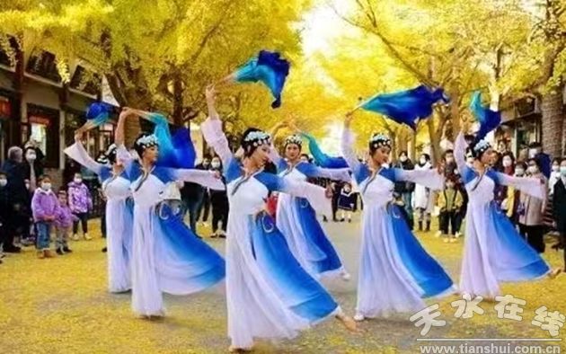 这一周,整条黄金大道是一个盛况空前的天然舞台,各种表演纷纷登场。伏羲八卦鼓气势恢弘,大气回肠。麦积飞天从麦积山石窟壁画中走出,从散花楼飘逸而来,轻舒长袖送来温情。银杏姑娘身披金色叶片长裙,飘然而至,令无数人遐想无比。汉将军姜维重返故里,飞将军李广武术登场,秦腔艺人粉墨扮相登场,一曲曲秦腔吼出西北人的豪爽。就连孙悟空也不甘寂寞,十万八千里一个跟斗赶到,挥起金箍棒,搅动得黄叶金光闪烁。盛装出场的大爷大妈们在金色的背景下翩翩起舞,广场舞、街头舞尽情显摆。热情奔放的新疆舞者,身着华美衣裙轻盈飘洒,灵动活泼,激情豪放中将维吾尔民族的独特魅力尽情展现。几十名身着盛装的西藏歌舞表演者,轻快活泼,舞姿舒展豪放,将喜马拉雅的风采带入这座古城。孩子们的拉丁舞潇洒自如,动作轻盈而灵活,浑身散发出青春的活力和力量。儿童们的打击乐、架子鼓表演,激情豪迈,动感十足,使人们惊叹不已。更引人注目的是有许多人自编自演,自唱自娱,歌曲,秦腔,舞蹈表演,展现自己的才艺,显露出自己的才华。