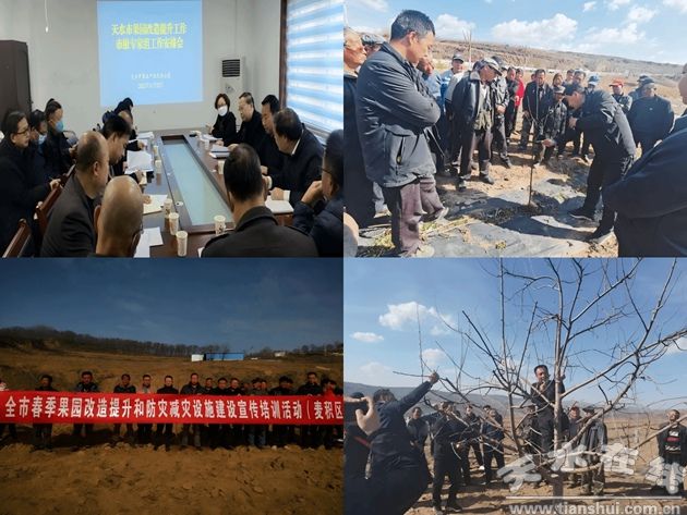 一是精心谋划定政策。在深入调研论证的基础上,市委、市政府制定出台《天水市果园改造提升奖补方案(试行)》(市委办字〔2022〕48号),按照先建后补、以奖代补方式进行奖补。各县区立足特色优势,制定细化奖补方案,统筹安排专项奖补资金。二是宣传培训强引导。编印了《天水市果园改造提升技术要点汇编》,采取广播、微信等多种方式宣传解读奖补政策,有效调动了果农及经营主体的积极性和主动性。邀请国家苹果产业技术体系和西北农林科技大学等知名果业专家,同时组建7个市级服务队,深入县区及重点乡镇、村和果园改造一线,巡回开展政策解读和培训指导。三是抓点示范快推进。坚持“集中力量办点、示范带动全局”的方式,大力推广“龙头企业+合作社+基地+农户”等模式,以点带面、示范引领、整体推进,累计创建果园改造提升示范点62个2.46万亩。集成推广玛斯特红蛇、俄罗斯8号、北京7号等不同树种新优品种和矮密栽植、水肥一体、农机农艺融合、种养循环等模式,推动果业提质升级、联农带农。四是从严把关保质效。坚持外调、内育相结合,择优引进国内先进的砧木和新优苗木600.83万株,新建育苗圃336亩。严把老树挖除、土地整理、土壤消杀改良、栽植覆膜等关口,全面落实栽后追肥、补水、病虫害防控、间作套种等管护措施,确保改造质量。全面规范验收审核和奖补资金兑付程序,确保实施过程真实、验收程序规范、资金使用安全。五是强化保障促落实。市委、市政府领导多次在市委农村工作等会议上对果园改造提升工作进行重点安排部署,先后4次在4县区召开现场推进会,督促县区学经验、找差距、促进度、抓落实。市上将果园改造提升工作作为对县区实施乡村振兴战略年度考核和平时督查考评重点,纳入年度目标责任书进行考核。市县两级农业农村部门围绕计划任务、老树移除、土壤处理、开挖整地、苗木繁育调运、定植管护、奖补资金兑付等进行调度通报,采取清单化管理、节点化推进,有效促进了任务落实。