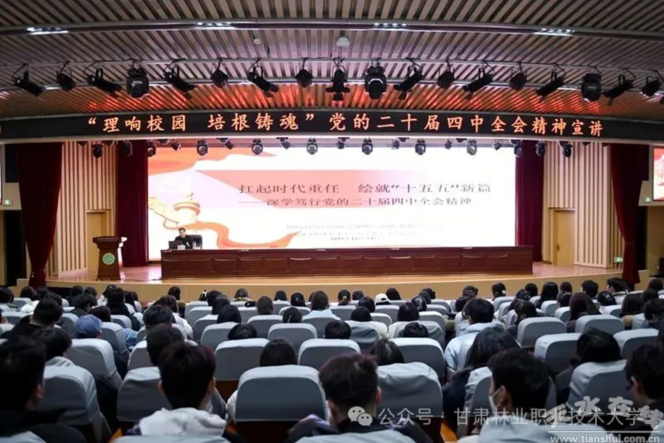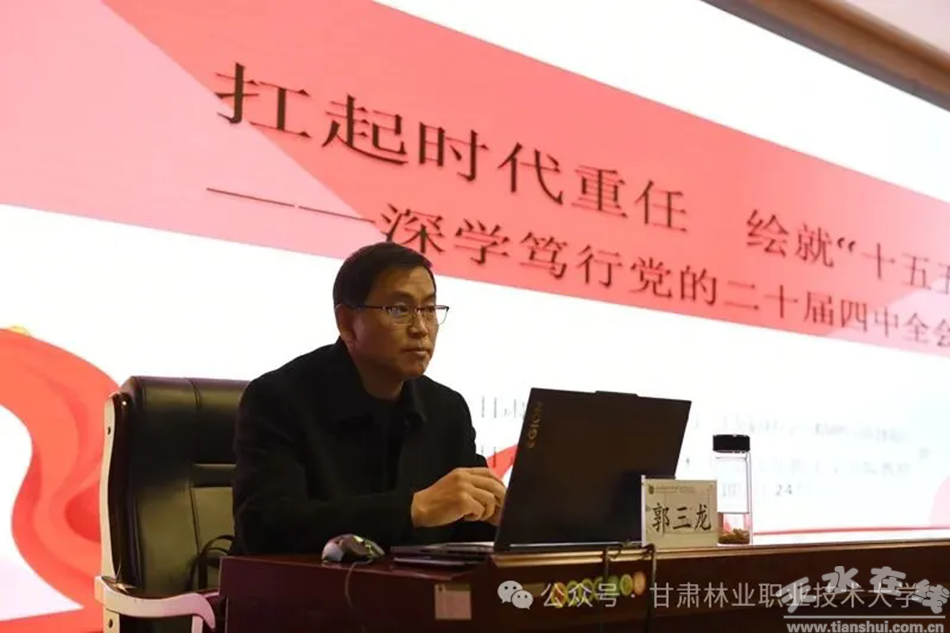 为深入学习贯彻党的二十届四中全会精神,11月24日,学校举行“理响校园·培根铸魂”党的二十届四中全会精神宣讲报告会。省委教育工委“理响校园·培根铸魂”党的二十届四中全会宣讲团成员、学校马克思主义学院党总支书记郭三龙以“扛起时代重任绘就‘十五五’新篇——深学笃行党的二十届四中全会精神”为题作报告,全体思政课教师、学生代表近400人参加。
