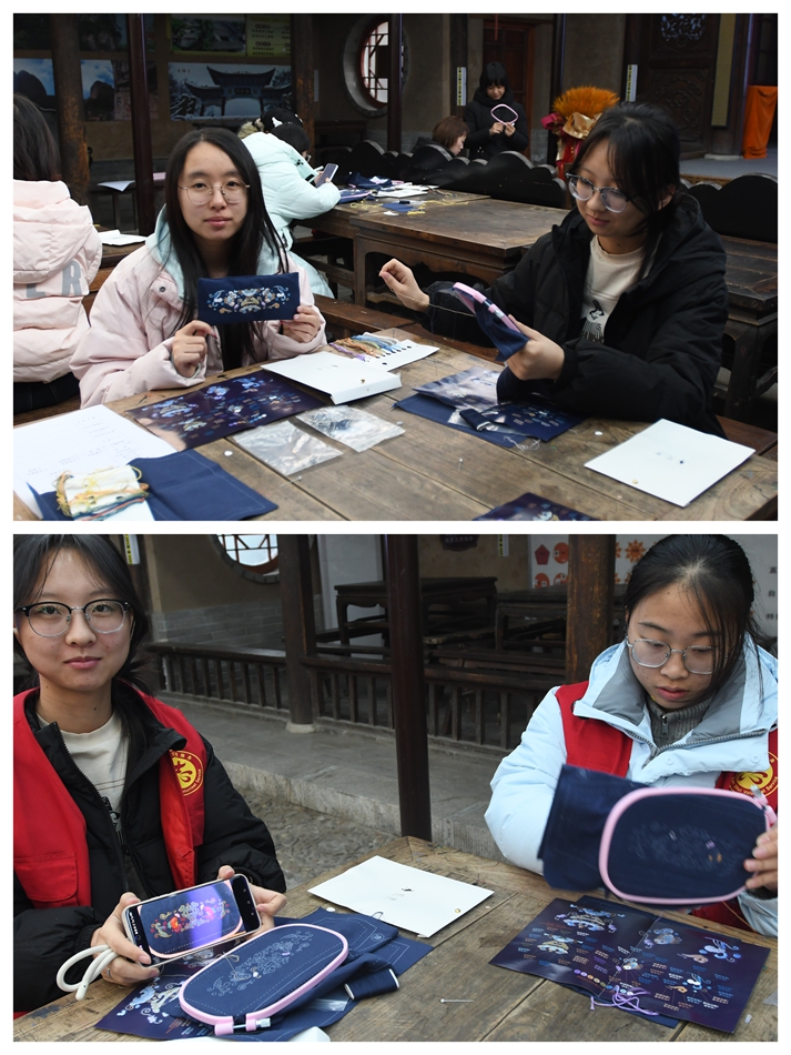 在刺绣技艺体验环节,社教老师现场演示缎面绣、裂开绣、轮廓绣、直针绣等基础针法,从穿针引线的小技巧,到纹样勾勒的关键点,每一个步骤都详细讲解,并不停进行示范。在老师的耐心指导下,同学们手持彩线,专注凝神,在蓝色布料上亲手绣制飞鹤、花卉、锦鲤等吉祥纹样。飞针走线间,大家不仅熟练掌握了刺绣的基本技巧,更深刻体会到傣族人民热爱生活、追求人与自然和谐共生的独特审美情趣。